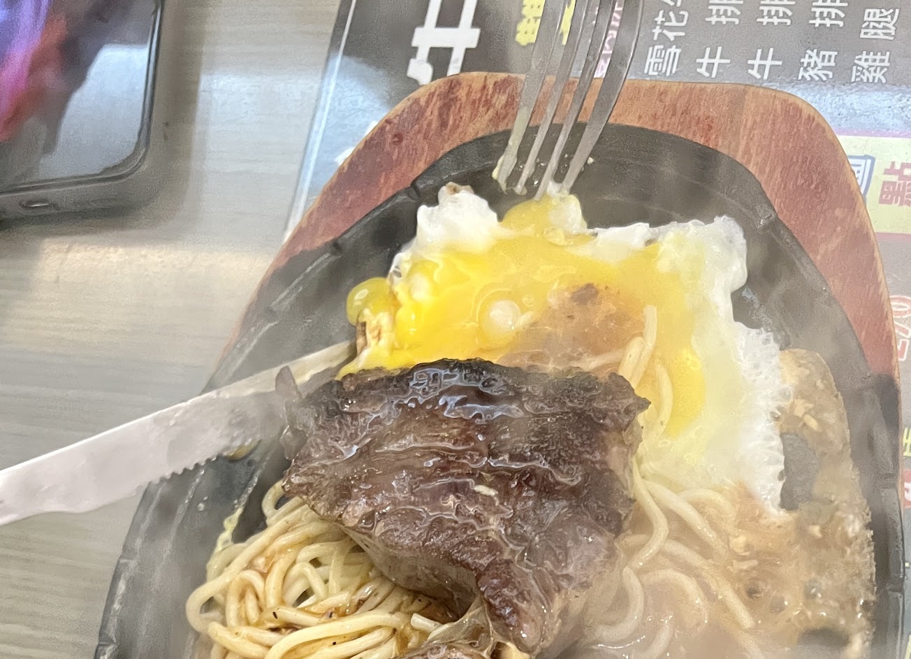 鐵板過熱 整個麵 蛋 牛排碰到鐵板部份 全都燒焦