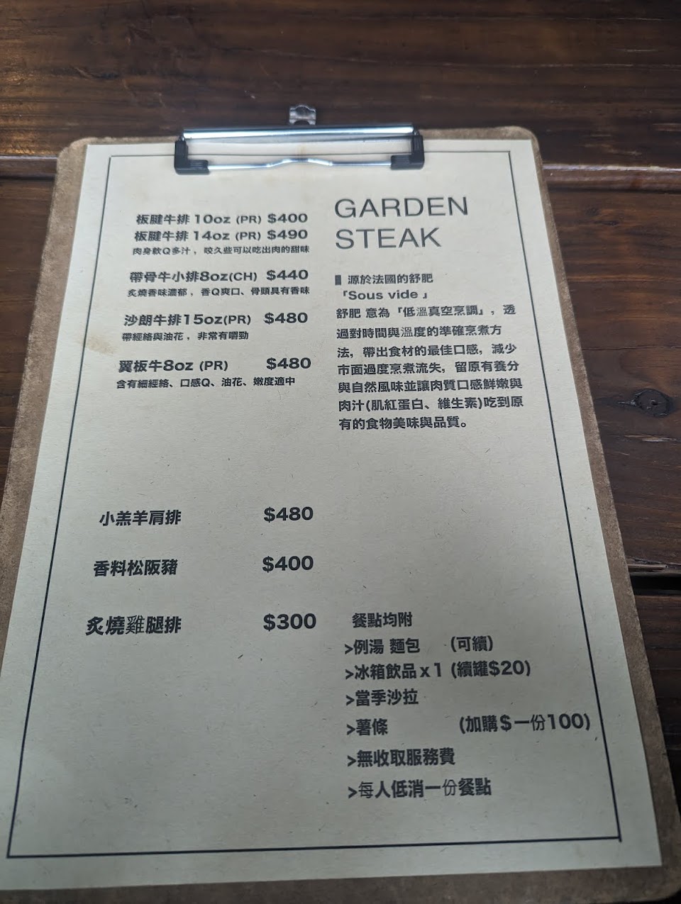 哇嗚!原來在這裏有一家如此低調的餐廳,內容確不低調。簡單的菜單裡賣點是牛排,雖然一開始覺得品項很單調,但卻想試試所有的肉品?遺憾的是18:00用餐?就沒了莎朗,羊小排。所以我們就點了前三類跟最後一個雞腿排。