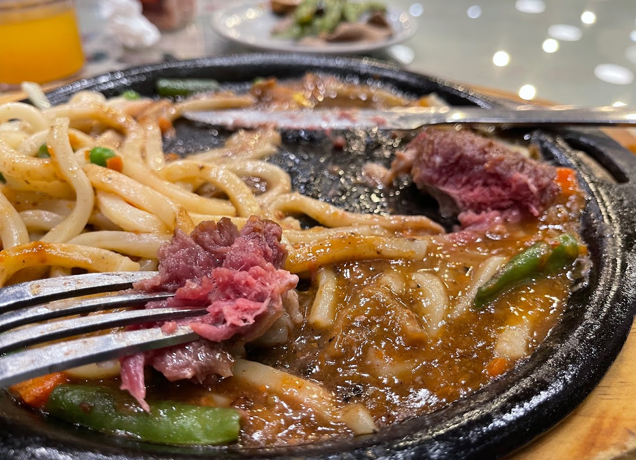 1. 牛排:沒有附蛋,可以選擇不要麵,ㄜ 但鐵盤上的蔬菜可能是焦黑的或是掉在鐵盤外。