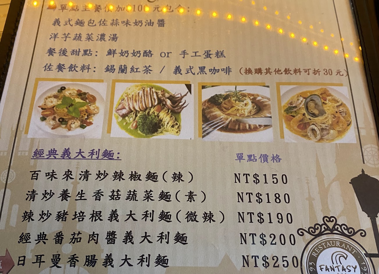 餐點上的主要以排餐、義大利麵、燉飯和披薩為主,因爲第一次來嚐鮮,所以點了番茄鮮蔬燉飯和蒜辣鮮蝦清炒意大利麵,這兩種主餐可加100元升級為套餐,就會多餐包、濃湯、甜點與飲料(紅茶或咖啡擇一),另外多點了羅勒什錦海鮮披薩和歡樂大拼盤,量其實很有飽足感,價位上整體花了1300多元。