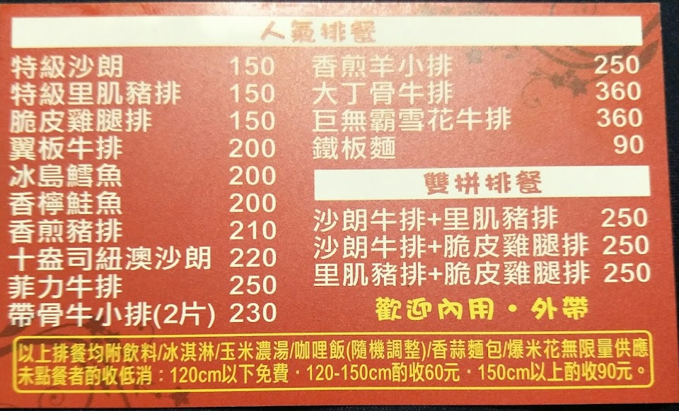 以平價牛排館而言,店內環境,人員服務及餐點提供都是物超所值的;店裡人員真的年輕服務態度很棒,值得推薦!