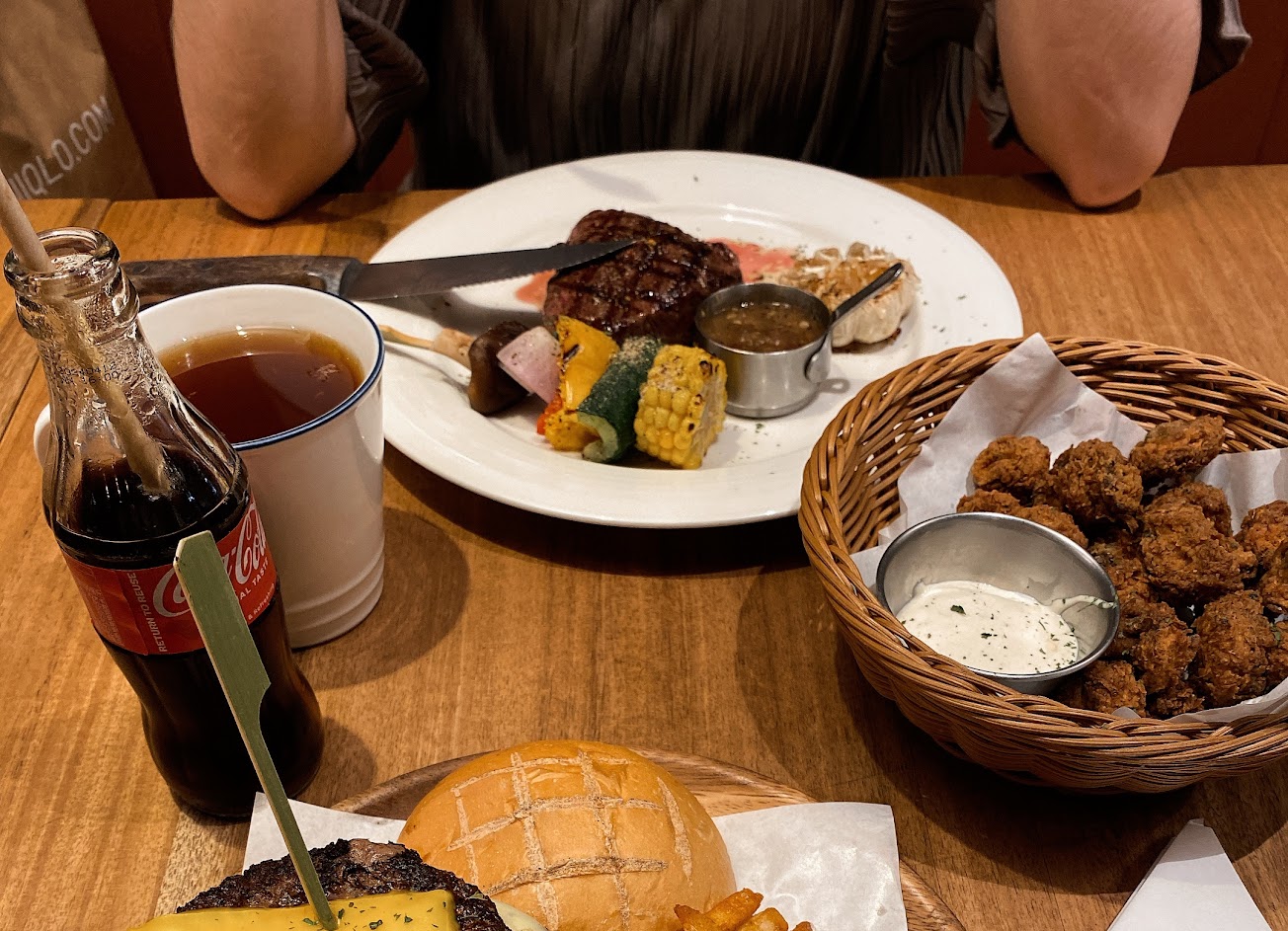 今天突然造訪桃園,突然想吃美式,今日湯品玉米濃湯,非常多玉米及蔬菜,味道濃郁,不錯?水牛城辣雞翅,非常推薦,它可以把sauce分開,不會很辣?香酥蘑菇的白醬好吃,但好罪惡?今日點的主餐分別是夏威夷堡&舒服雪花牛(女生選最小oz就很飽了)還可以點兩個配菜,我點奶油玉米跟蔬菜串,建議五分但我點七分,也不會很柴?加點蘋果派怕肉桂的人可以點,因為味道不會很重,烤得很酥脆?因為所有的食材都是現做的,建議在快吃完主餐可以請服務人員先準備甜點,避免等太久?