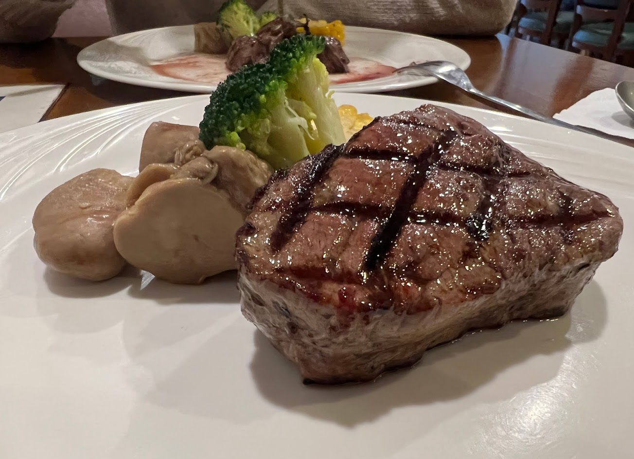 首訪點的是牛小排跟菲力,5分熟的口感恰到好處,搭配鮮甜蔬菜入口,完美!另外,套餐附的沙拉、湯品、麵包、飲料跟甜點都很不錯,滿划算的。
