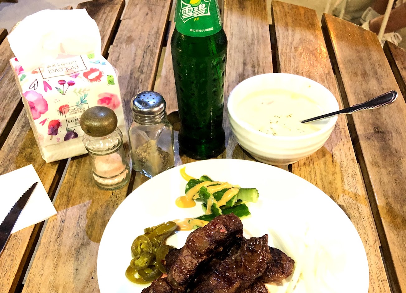 牛排的口感大概比夜市好一點,但價格是夜市牛排的兩倍。不知道是不是租金太貴,沒有鐵板麵、沒有麵包,只有幾根小黃瓜跟一碗玉米濃湯和一杯汽水。