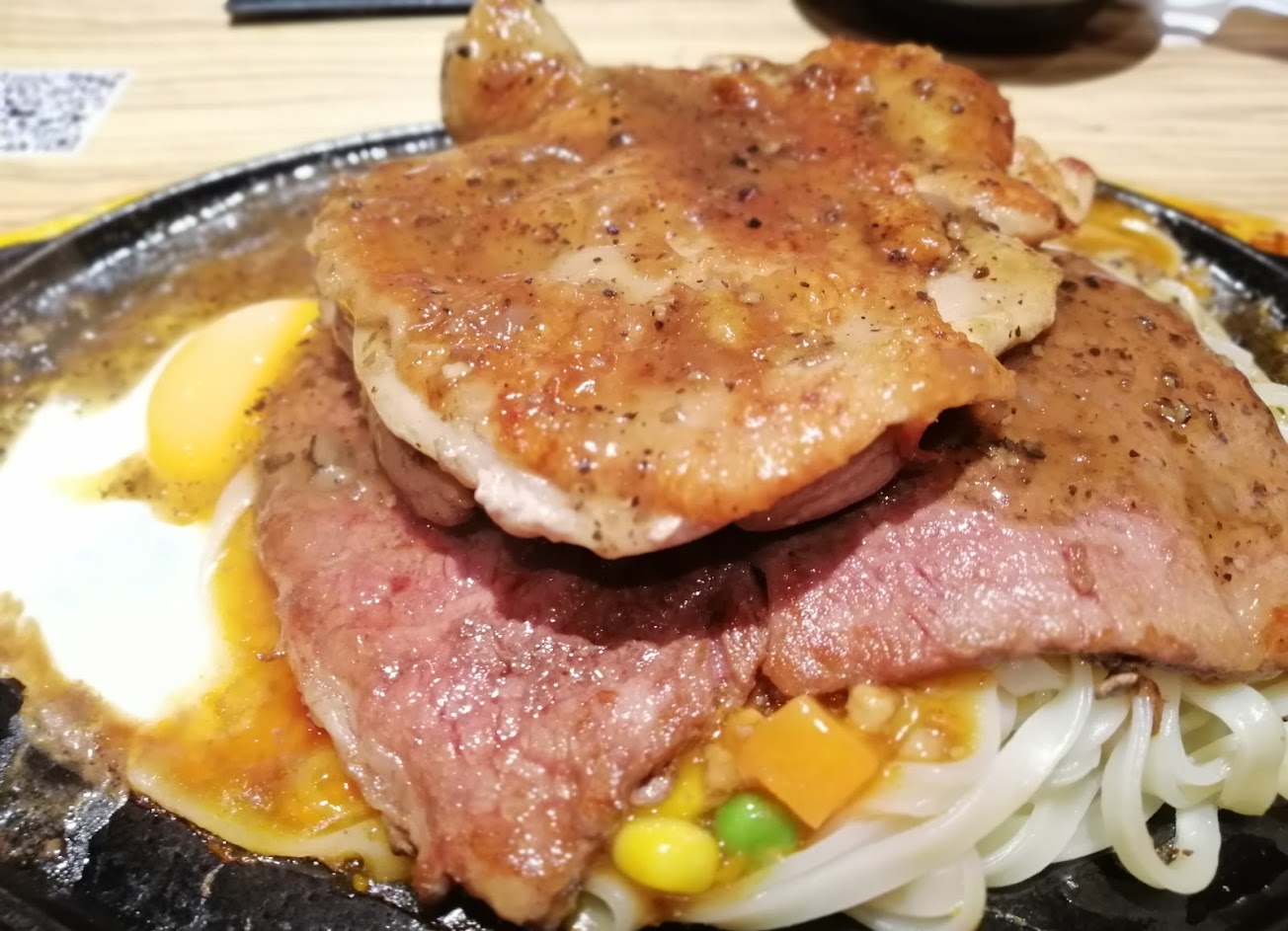 高CP值的原肉,150元的招牌牛排的肉質軟嫩帶點嚼勁,有點筋(可接受範圍),加80元可加點雞排/豬排/牛排(擇一)變雙拼;半熟蛋很可以、麵條還不錯(不是常見的黃麵或義大利麵)。餐包微爆漿,自助吧有紅茶(偏甜)、柳橙汁、玉米濃湯。整體來說份量十足,口味過關,重點:不是組合肉,可推!
