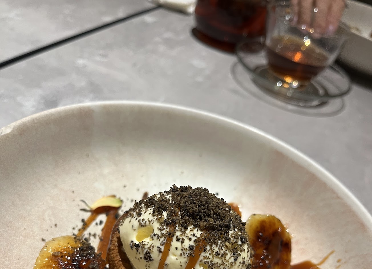 紅茶有幾分蘋果的香氣,卻對於店家選擇不加入相應的甜度覺得還不錯,畢竟甜甜的蘋果紅茶有點略顯廉價。酥皮捲我覺得可以稍微請服務員介紹上面的醬汁或是食品的冷熱度,畢竟上面醬汁應該是有一定的想法才會加入配搭,同時兩個品類的冷熱度有差異,應該會有希望客戶的用餐順序;凱薩沙拉感覺有點怪怪的,畢竟這四個字在定義上應該是有熟習的公式組成,個人覺得加入炙燒過的蔬菜已經算是還不錯的新想法,但炸雞略油對於沙拉的搭配有點怪怪的,畢竟點凱薩沙拉的時候應該會更希望得到濃郁的凱薩醬;熱前菜個人覺得伊比利豬較為出彩,辣味醬汁對於較油的肉品有很好的解膩效果,但海鮮燉飯球內的起士調味有點比重過多,希望可以有更多食材本身的味道;湯品、麵包我覺得可以選擇在發酵過程中產生更大發酵氣室的麵包,而不是店內吃起來口感較為緻密的口感的類型;主菜絕對是定價策略劣勢體現的點,因為如果更貴的價格絕對可以選用更貴的肉類,香煎菲力希望可以在牛排外殼有脆殼,雖有搭配地瓜酥,但我覺得契合度沒有很高。另外法式鑲雞裡面的起士可以選用多種起士或是在調味加入松露、胡椒等其他調味元素,這樣除了可以提升食物檔次外也能增加除了單純的起士味道,然後南瓜醬其實沒有很搭;甜點我覺得香草冰淇淋可以用兩支湯匙互相刮成柳葉狀放在盤子而非超圓形放在蛋糕體上,莓果米蘇的容器可以冰過這樣上菜後就會不在上面有露水而影響美觀程度。