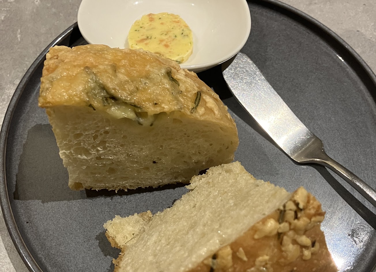 麵包-佛卡夏麵包佐自製奶油:佛卡夏麵包不知是否是自製,但至少有高級麵包店等級,搭配的奶油是很經典的法式香草大蒜奶油,不過主廚還混入了煙燻鮭魚去增加煙燻味,好喜歡?