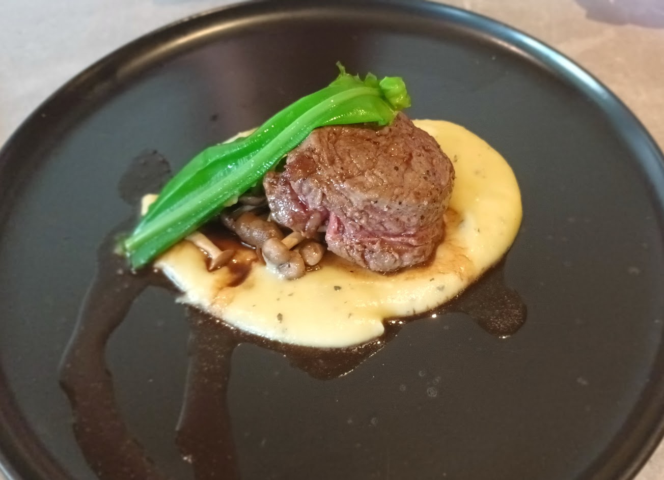 看的到有點血色但依然是要讓人嚼很久很久覺得不太ok 另外搭配的蕈菇味到重到吃不出牛排的味道