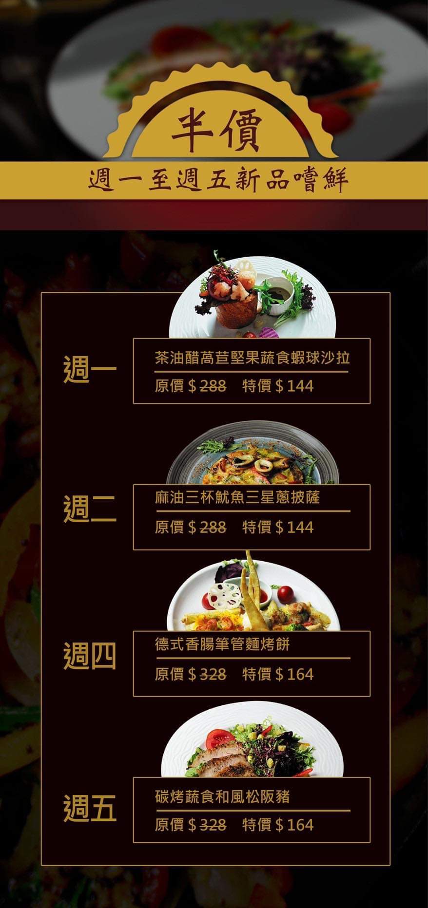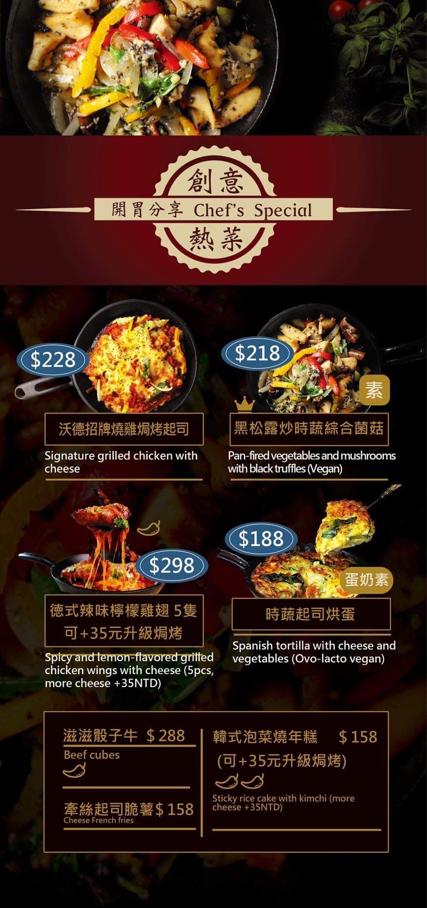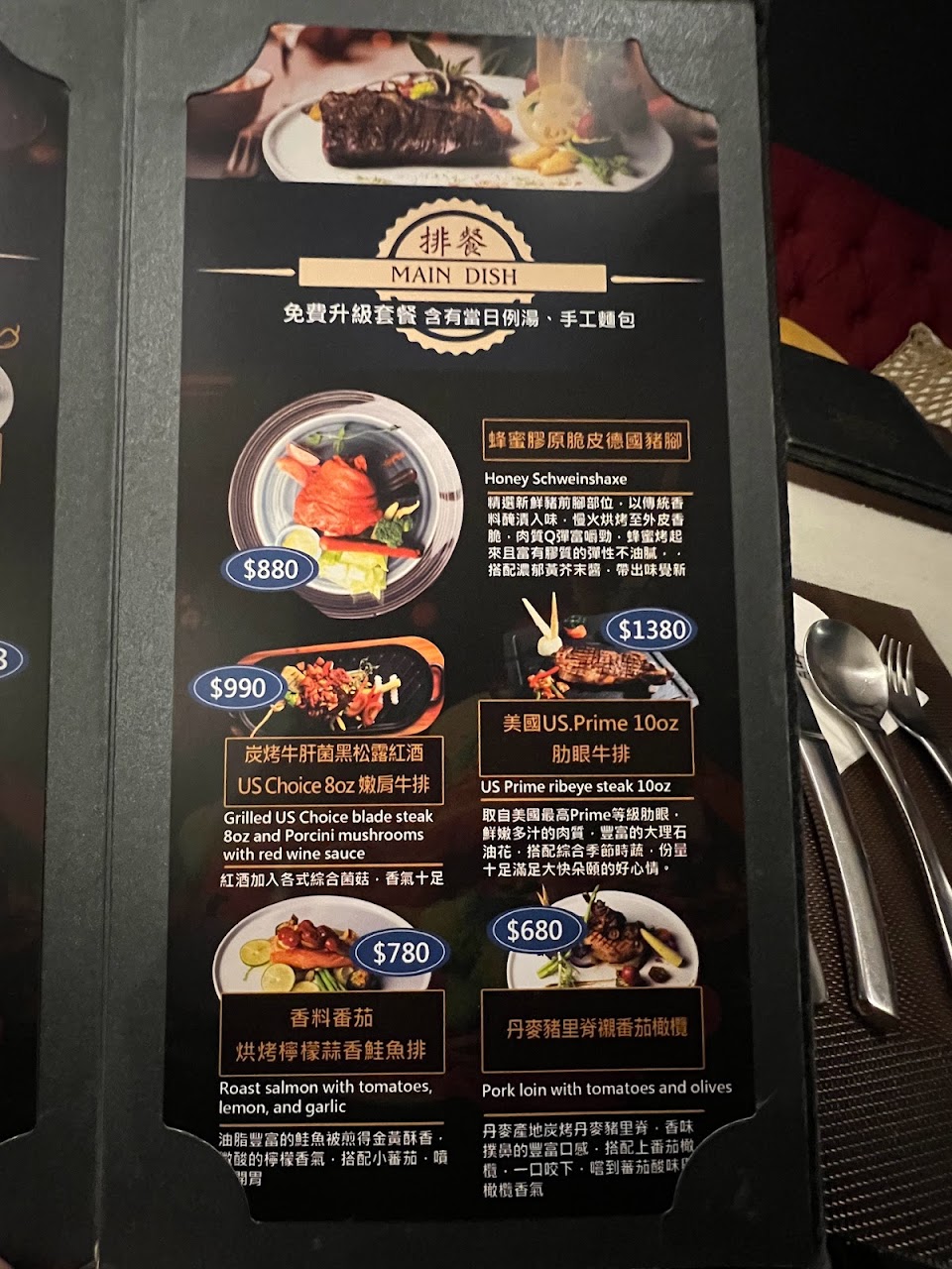 嫩煎牛排, 時蔬起司烘蛋, 前菜, 披薩, 炭香雞腿排, xo醬骰子牛時蔬炒飯
