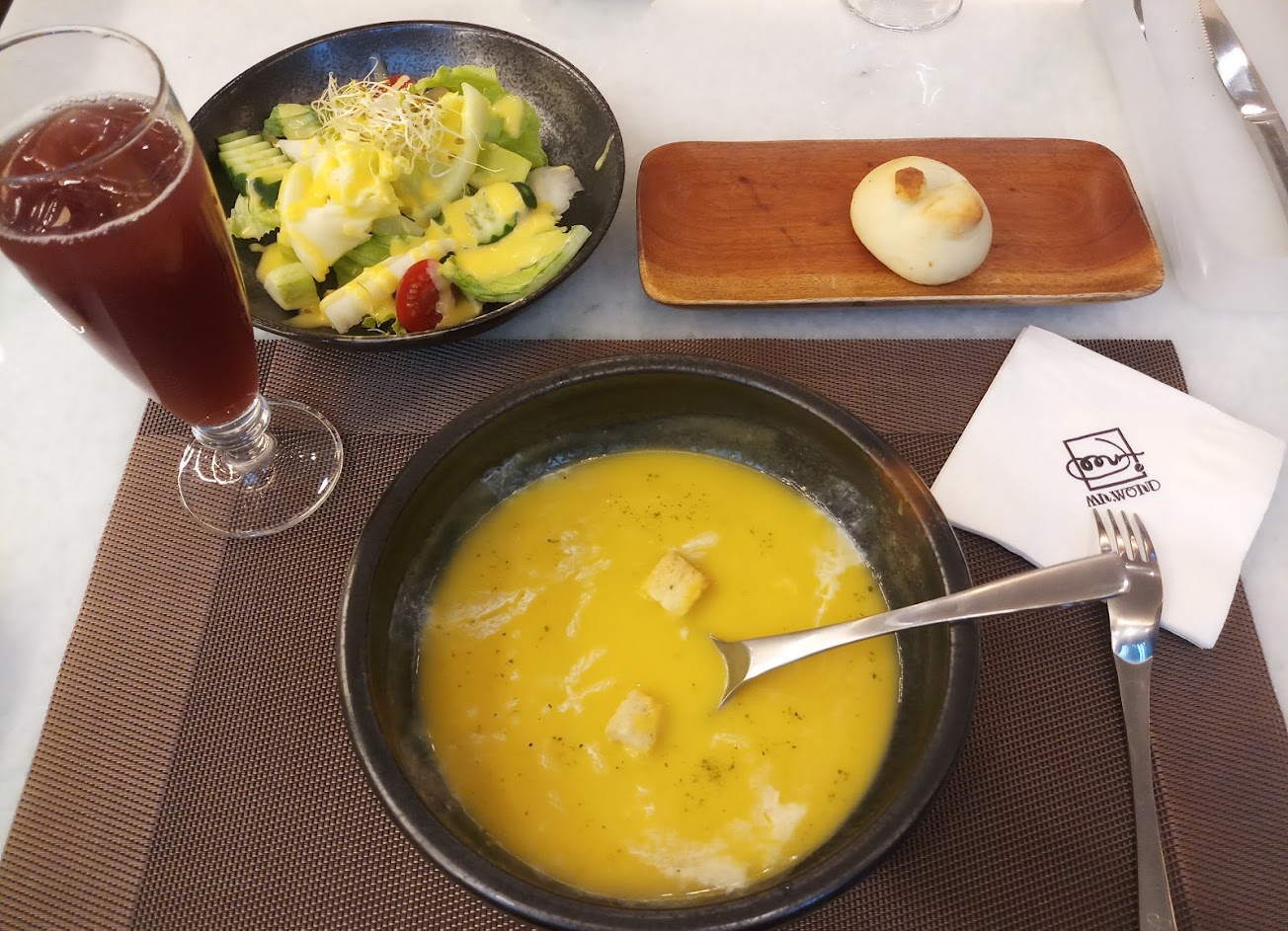 例湯偏鹹,麵包是還行,只是搭配蔓越莓干…不愛