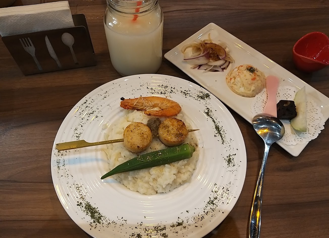 用餐環境寬敞舒適,乾淨,服務態度很好,餐點美味的確有異國風味,這個價格個人認為值得,美中不足的是餐廳位置停車不方便,即使是騎機車都要找地方停車