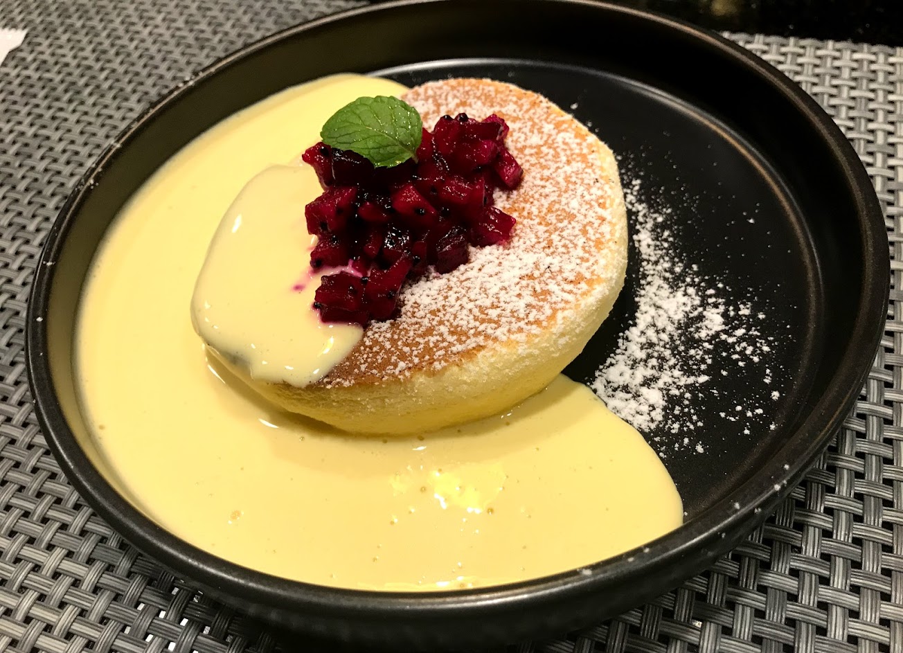 甜點舒芙蕾上方放上紅龍果,佐上水果味的醬也相當不錯。