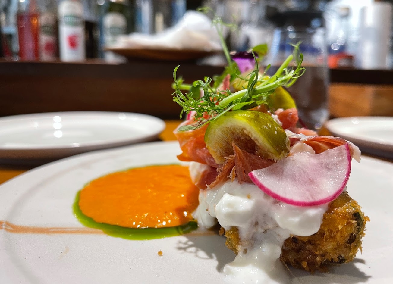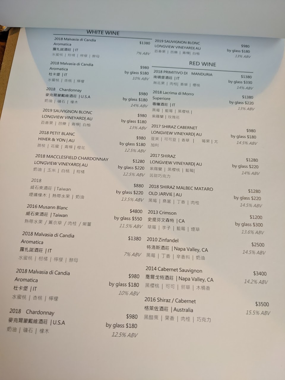 鹽酥蒜味薯條, 貝里斯拿鐵, 鴨腿溫沙拉, 桃園黑豬帕瑪火腿, 豬肋排, 青醬手工花捲麵加干貝, 蒜炒白酒綜合貝類手工寬麵