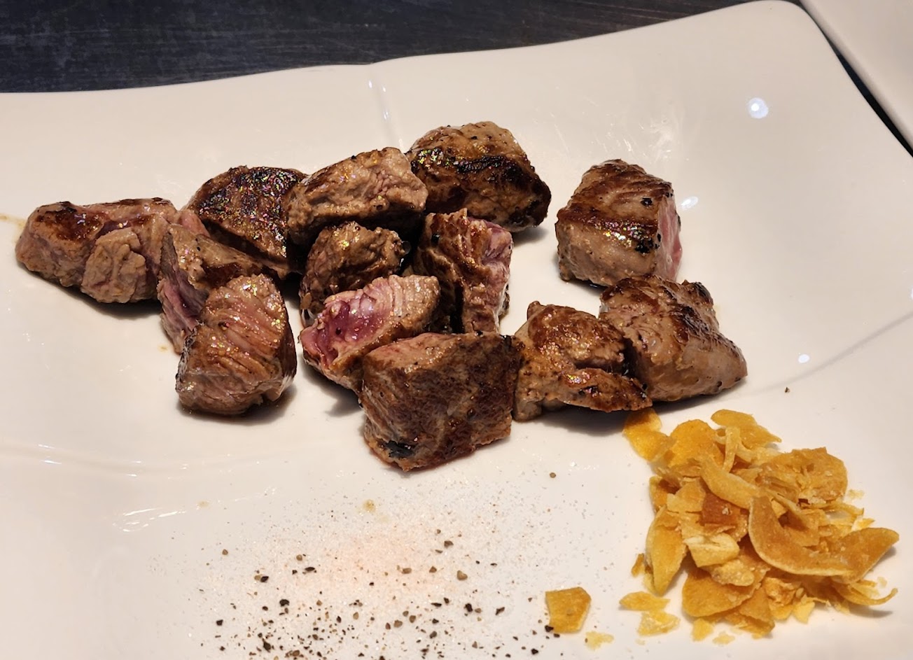 牛小排(肉比較少的那一盤)我覺得味道很夠了可以直接吃不用再加醬,蒜片⋯還好,沒啥味道有口感而已。