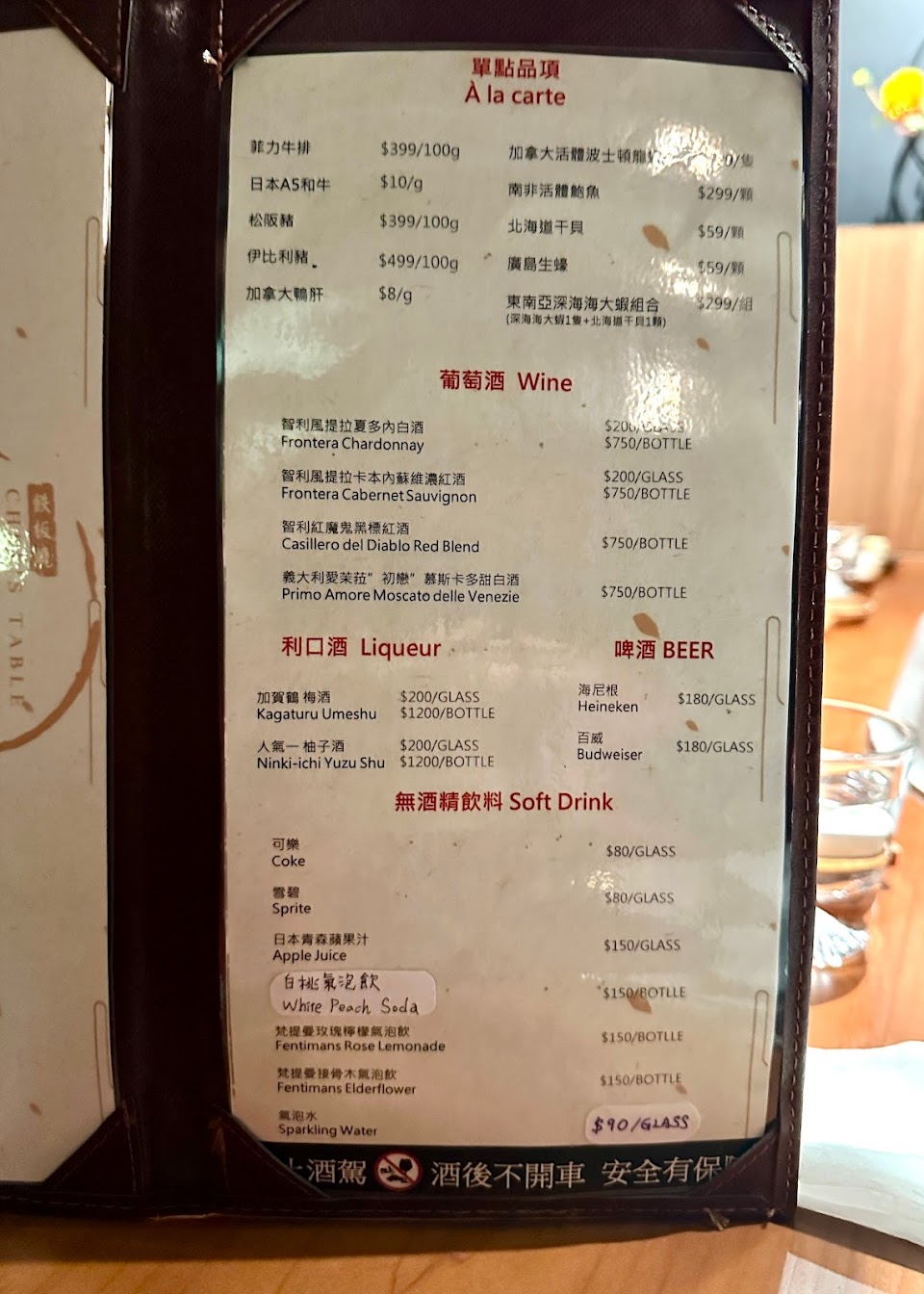 我們本次選擇的無菜單料理共10道,有家人有升級成1580的日本A5和牛套餐,我則是享用一般的但加點大蝦&干貝299/份。每一道料理都處理的非常好,且主廚還會再食用前詳細說明與介紹食材。每道料理都非常的美味,食材格外新鮮,價格來說也很合理,坐在主廚面前看他們表演一場很華麗的法式風格的饗宴,非常尊榮。