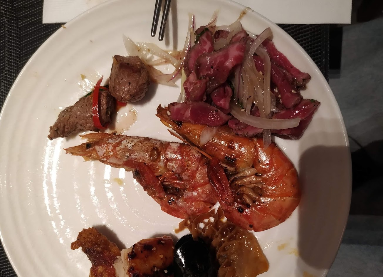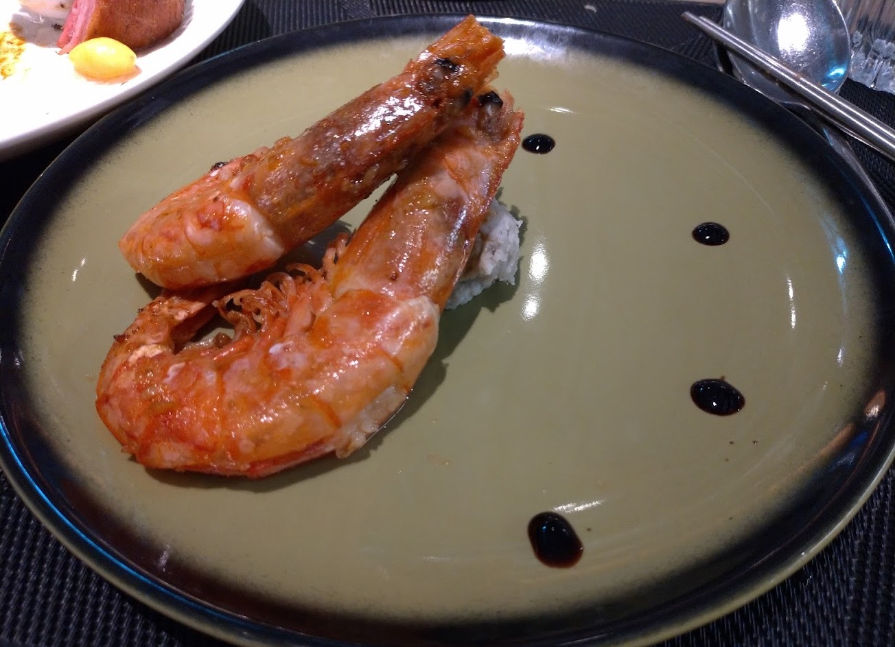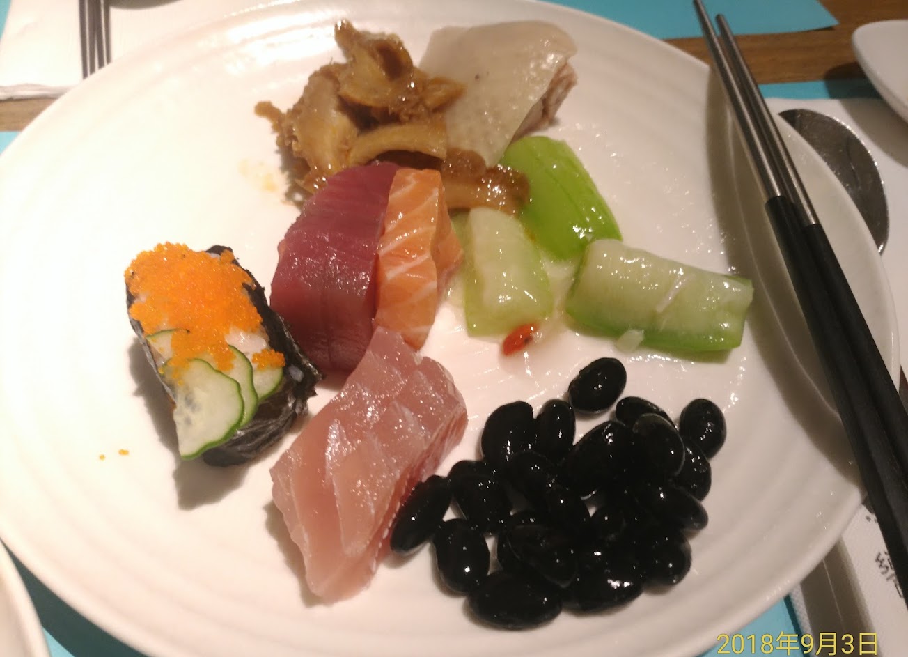 這次主打螃蟹和蝦料理,螃蟹不夠新鮮,但幾道蝦子料理倒是都很不錯;其餘菜色、甜點、水果還是維持水準之上;個人一直偏好和風炸物,但今天炸物都稍油膩,尤其是茄子,一口咬下覺得噴出油來,如果能改善油膩感會更好吃