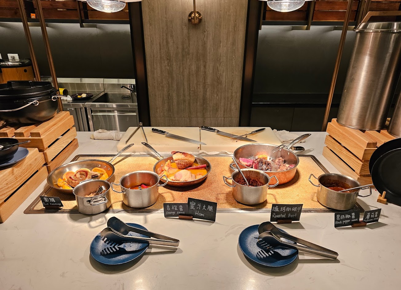 用餐區有露營區風格及一般風格的座位,整體空間算是舒適,餐食區有生魚片、冷菜沙拉、熟食、蒸籠、串燒、冰品、飲品、甜點水果…等,品項看似許多,口味大多普通,食材鮮度也一般,整體而言以五星級飯店來說是有失水準。
