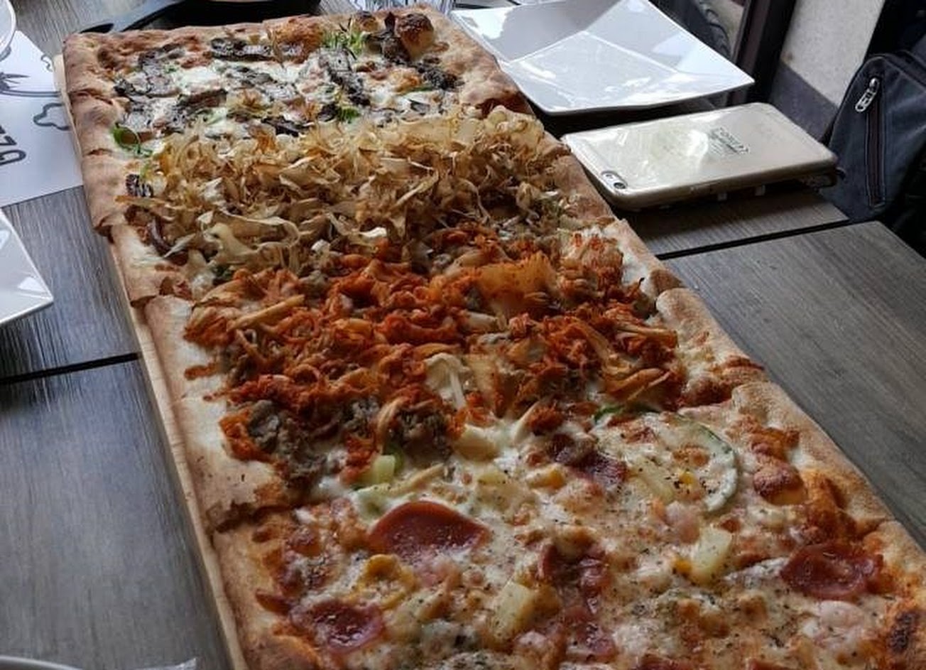 披薩很好吃,多人聚餐可以點大披薩,一次可以選四個口味,而且有很特別的口味,像是打拋豬肉.鹹豬肉等一些其他特色菜的料。