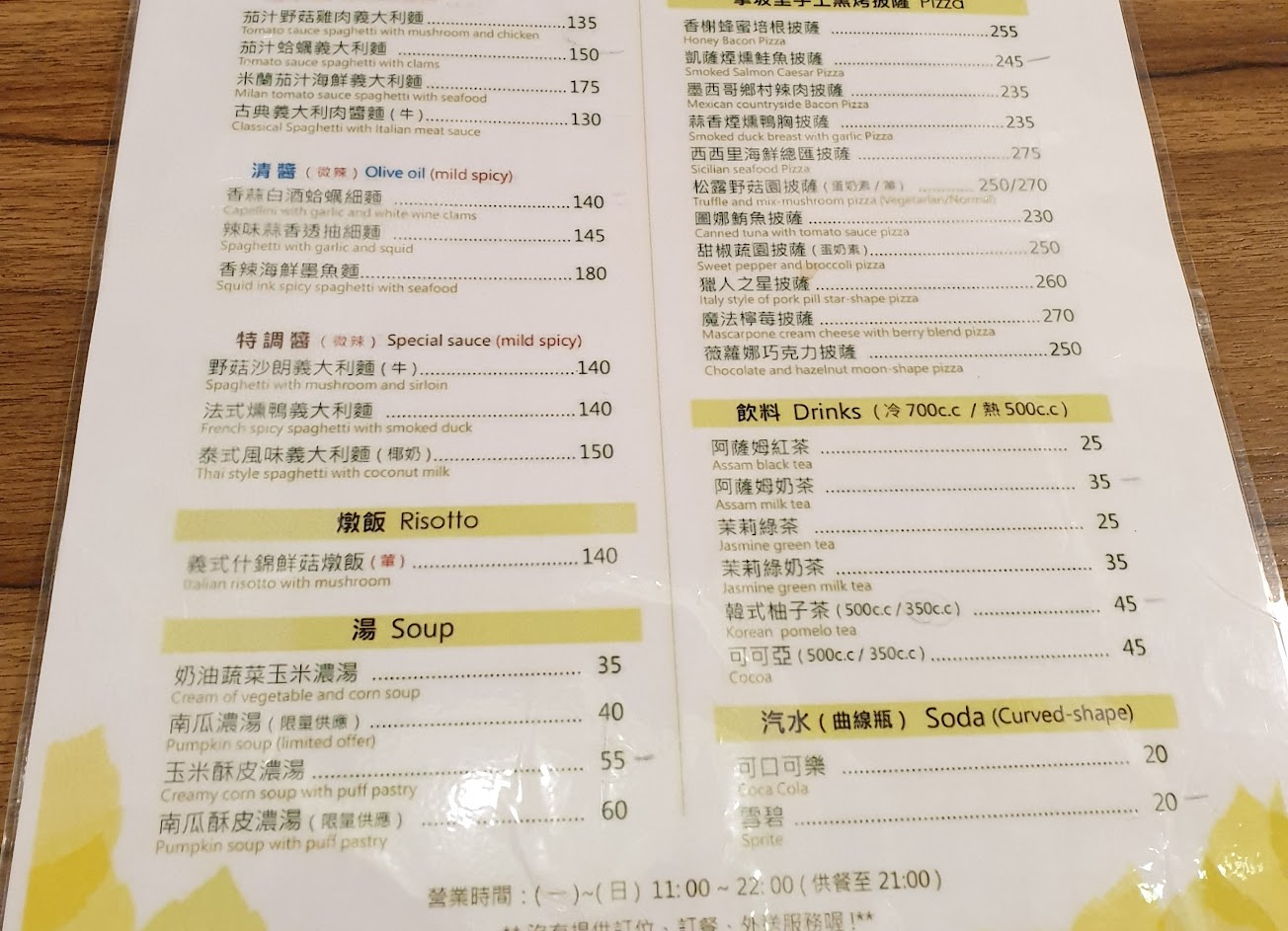 3/13下午6點用餐,等位子時說不能先點餐先做(因為怕點現烤pizza 會等很久)。只說今日沒有南瓜濃湯,但等到我們點餐時才說沒有海鮮pizza (但卻看到比我們晚來的人有海鮮義大利麵?)怕等更久且情急之下只好隨便點了鮮菇xx口味。