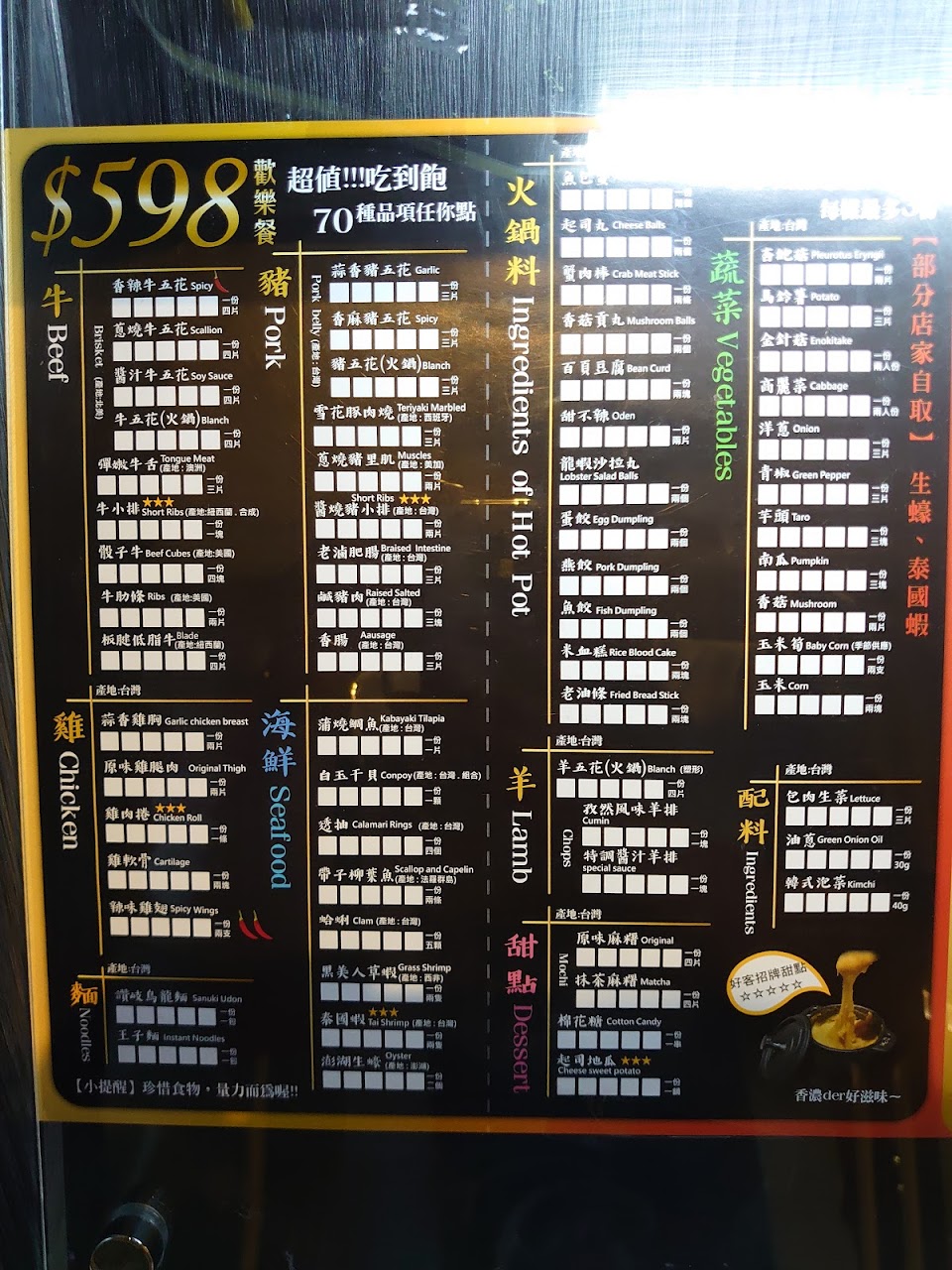 今天座位不到3成滿,送餐速度慢、限制點菜數量、限制下次點餐時間(等五分鐘以上才能點餐)、偷偷刪菜單(菜單的菜色消失,沒辦法點第二次),第一次遇到吃到飽餐廳怕被吃太多