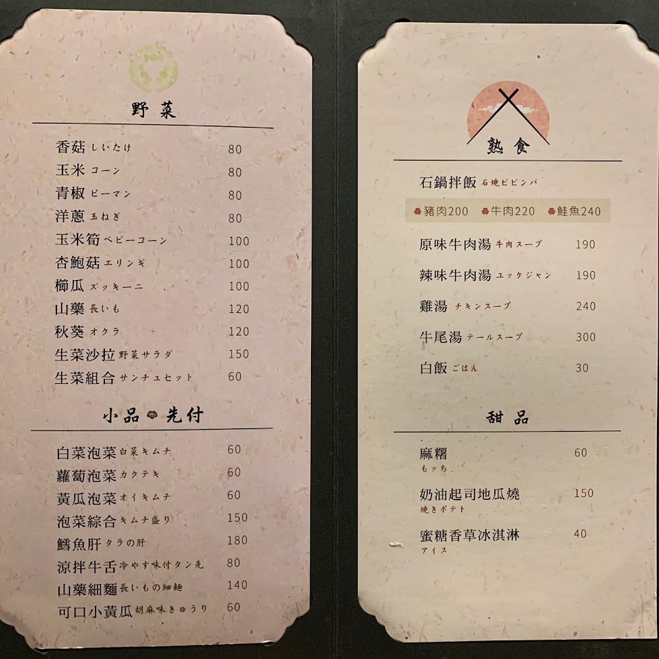 石鍋拌飯, 松阪豬, 起司蕃薯燒, 嗜燒肉, 月見和牛, 生食級花枝