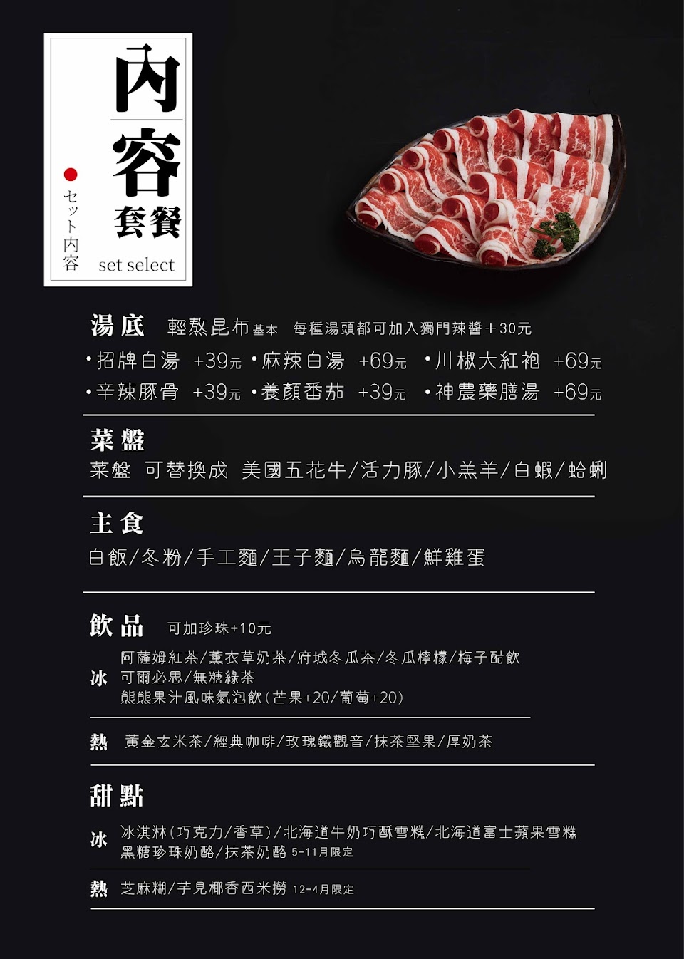 店家提供四款湯頭有柴魚昆布湯跟日式白湯和辣白湯與蕃茄湯。柴魚昆布湯有淡淡的昆布味,而日式白湯則是豚骨湯加牛奶與白味噌熬製湯頭,視覺上看起來很厚重,有淡淡奶香回甘的味噌口感。時蔬盤沒有過多加工品火鍋料,菜色與新鮮度都有。主食選擇手工麵,加些胡麻佔醬好吃!海鮮船的海鮮非常新鮮。餐後飲料與甜點普通就是。