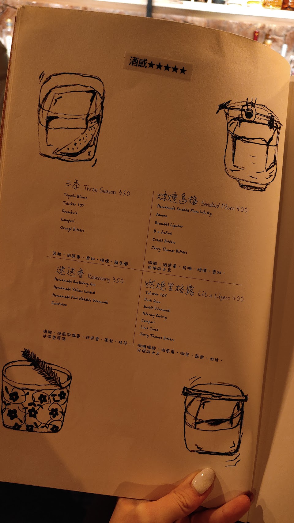 配合冬季元素,入口第一個味道是薑味(怕薑的人可以斟酌)薑味之後是酸甜的味道,以綠茶琴酒為基地,很清爽,作為第一杯酒飲用很適合!