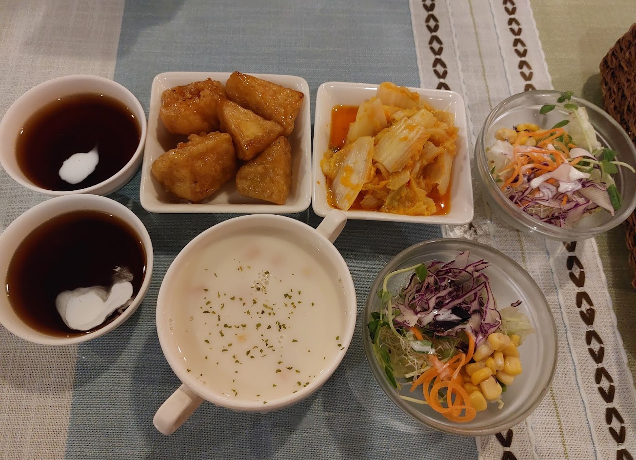 今天炸物部分都表現得非常好,讓人一口接著一口,明明是素食卻像真的雞塊味道一樣。可惜在套餐的配菜上:沙拉、茶凍、濃湯都較不驚艷。濃湯雖有淡淡奶香味道,但實則不濃郁。茶凍與沙拉明顯是冰箱先擺盤好再拿出,無太大特色。主餐方面也稍嫌可惜,印度口味的義大利麵收汁不夠過水,也比較像是小學時吃的午餐咖喱口味。另外沒有拍到的丼飯,醬汁不夠,味道稍嫌淡了些,飯上鋪滿了海苔送上久了容易軟化影響口感~建議店家可以做些調整。但飯上的炸杏鮑菇酸甜的味道不錯。