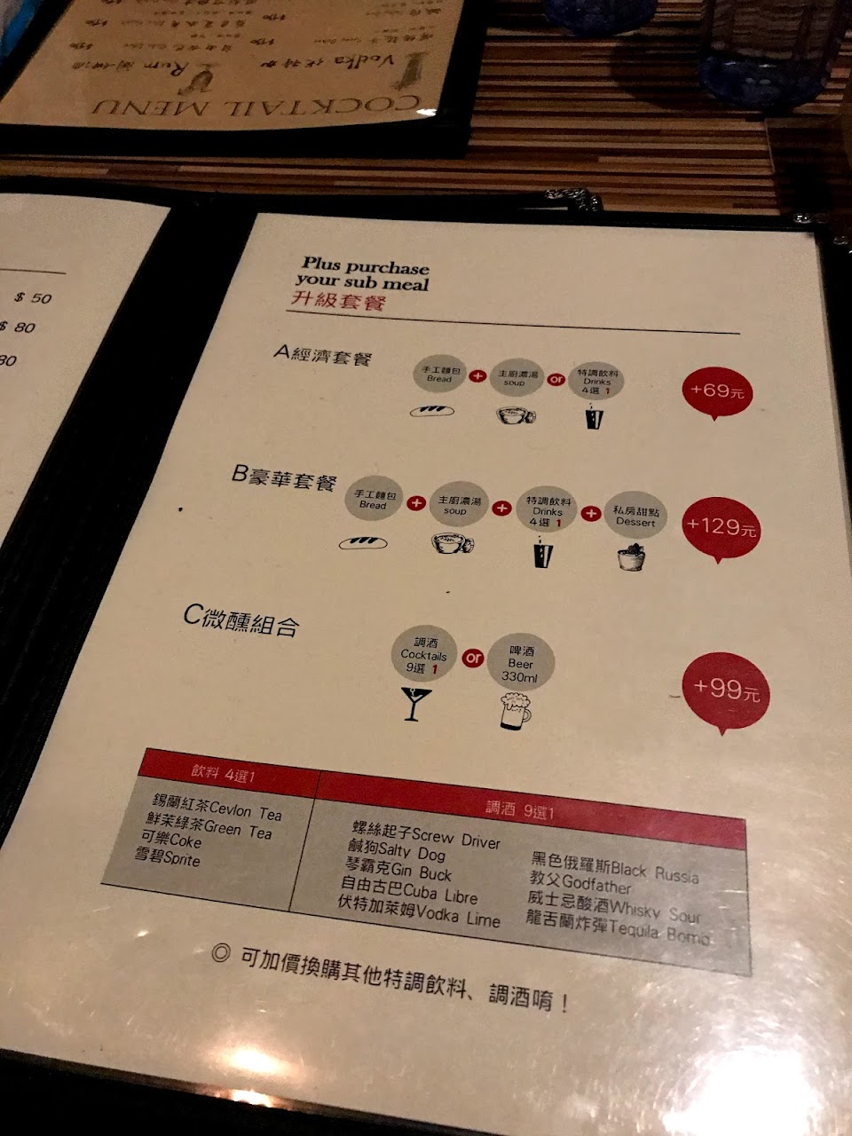 之前的小聚會都是喝喝酒點個炸物,聊到凌晨深夜,這次剛好在吃飯的時間相聚,每次都看其他客人點酒館的餐點,這次當然不會錯過,我們每個人都點了一份餐跟飲料,好一點的會升級套餐,價格位於200~300有找。