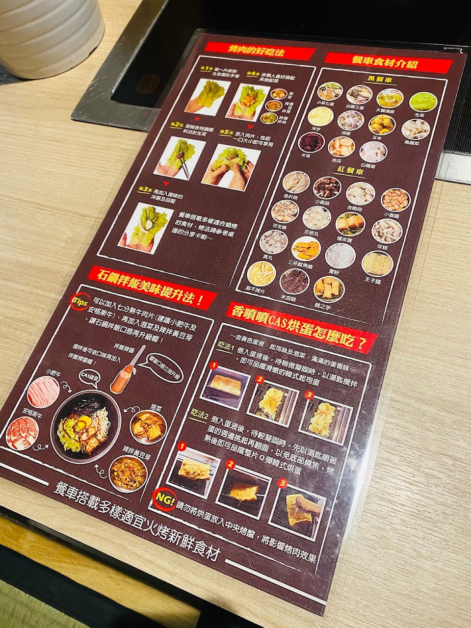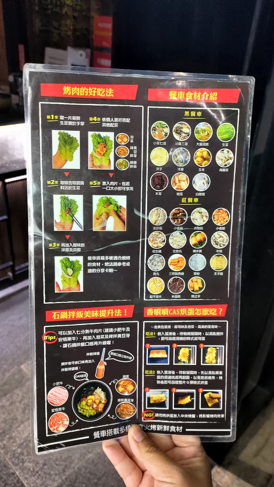 肉類、包肉生菜、飲料要跟服務人員點餐;燒烤小料、小菜、火鍋料是用推車服務。