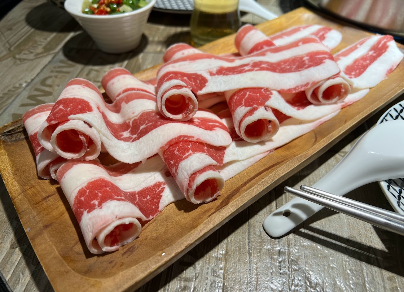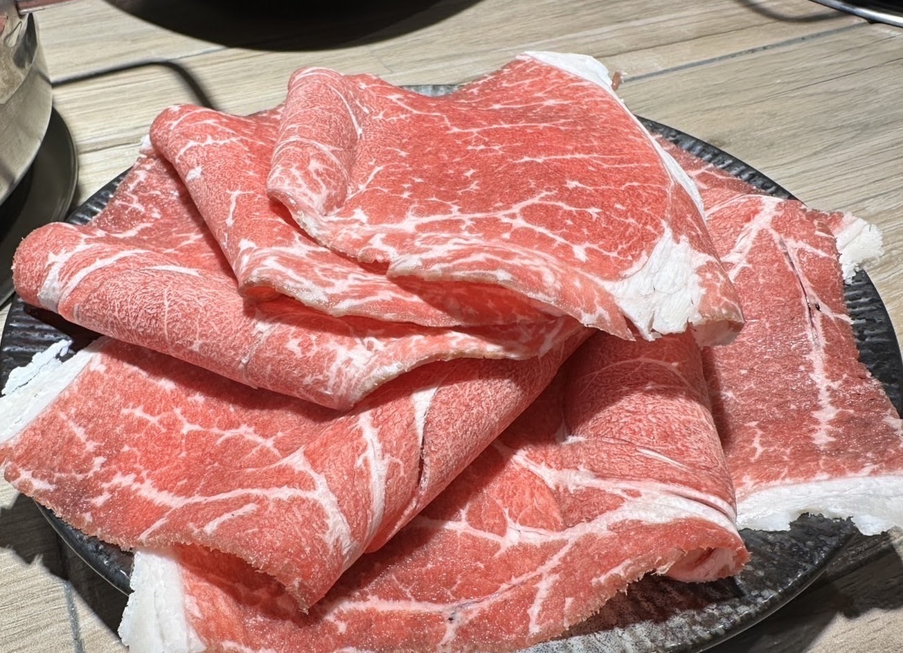 看球賽到一半來吃鍋物,因為不熟附近,索性看見了這間火鍋店,站在門口看菜單時有點被嚇一跳,以為都是要一人一千多才出的來,後來在往下看一個肉鍋從370元起跳就進去嚐鮮,初次吃因為時間有點晚了,只點了6oz的肉。因為是圓桌的關係與朋友共鍋,我們只點了一個湯頭昆布,喝起來很清爽,不鹹。點了基本款的小肥牛,涮好馬上吃好好吃肥瘦的部位剛剛好??品質口感佳。因為三人的關係我們有換掉一個餐盤點了基本款梅花豬也是好吃,換的肉品片數也不少。