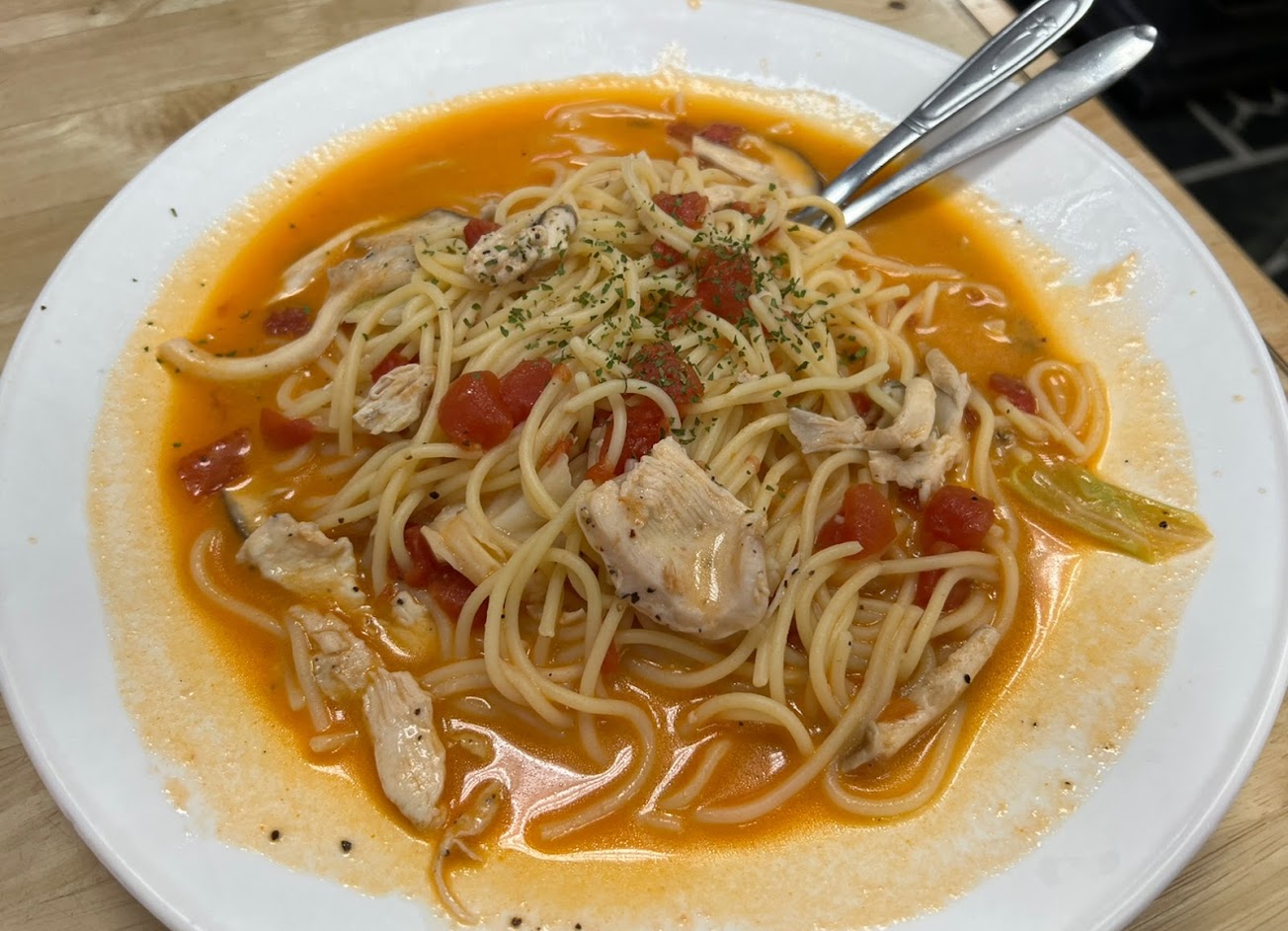 店內環境還可以,價格普通,有免費的紅茶可以喝。這次點了焗烤奶油煙燻雞肉和番茄雞肉麵,雞肉很嫩,個人覺得餐點沒有很鹹,可是另外還有起司粉可以加,出餐速度也很快~