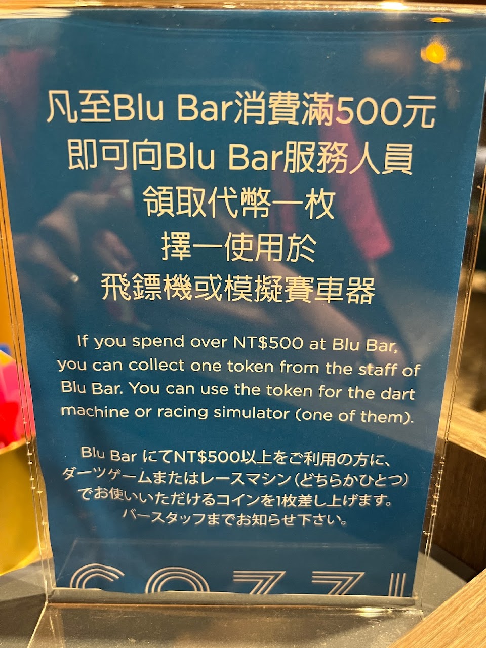 Cozzi blu 跟 blu bar都超讚!點了漢堡、義大利麵,調酒是挪威少女,餐廳擺設很讚??!服務人員態度超優!如果是要來水族館參觀買套票(999元)真的很超值!可選主餐跟一杯調酒(380元)!總之很推薦飯店跟bar!!! …