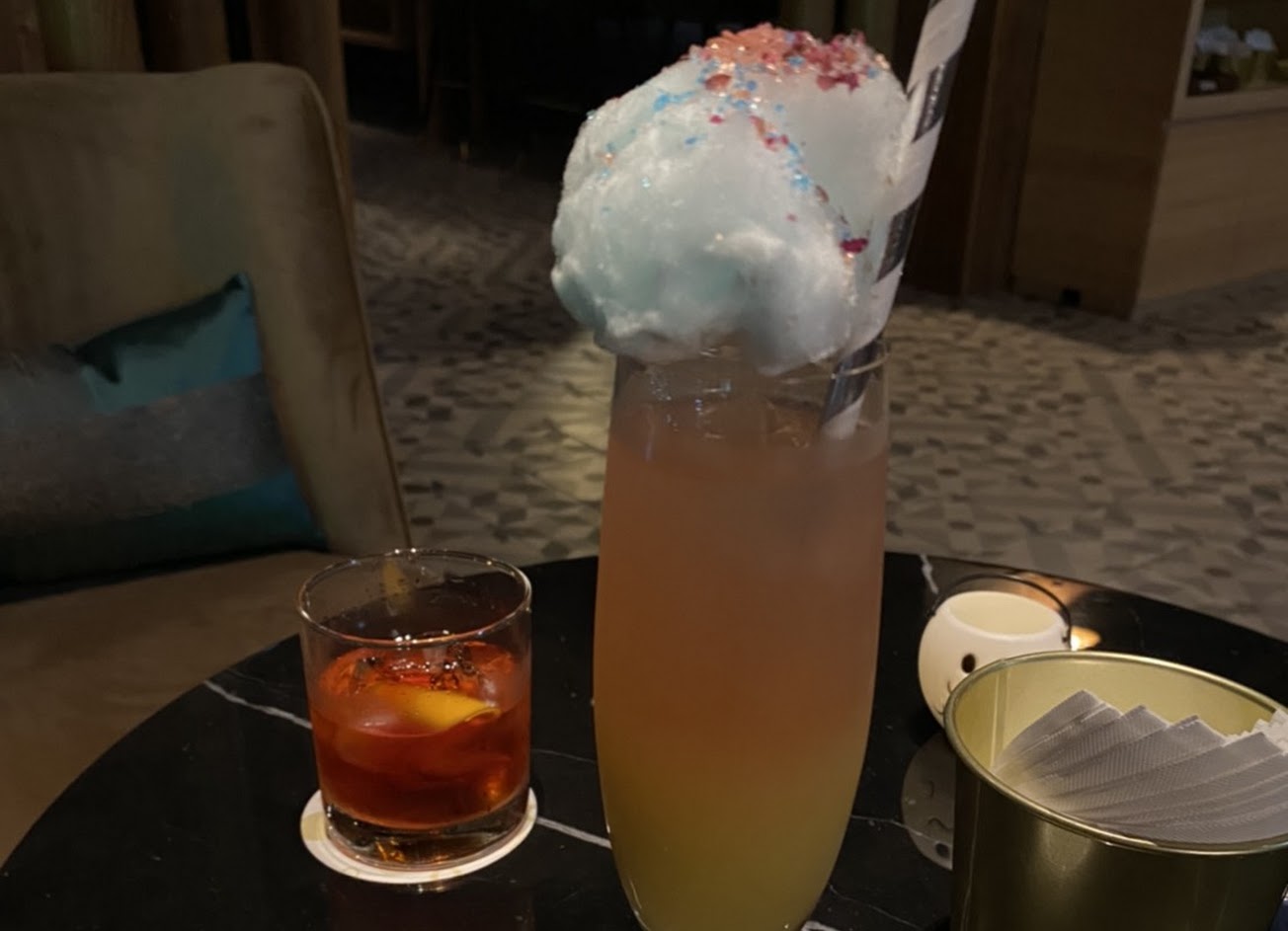 連假期間入住和逸桃園,晚間看到廣告就順勢來了Blu bar,點了杯期間限定點閨密專屬特調-巴比倫空中花園,是杯甜甜的水果酒(幾乎沒有酒精感),酒上面有一球棉花糖,加入後使的酒變成了氣泡酒的味道,甜度甜而不膩,是個很棒的體驗:)