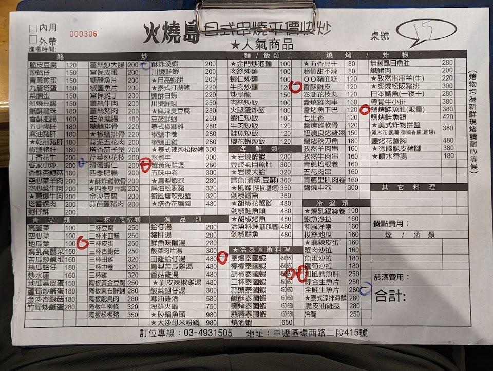 一共點了八菜一湯,大部分餐點口味達標熱炒的口味,但香菇雞湯是沒味道的(打槍)