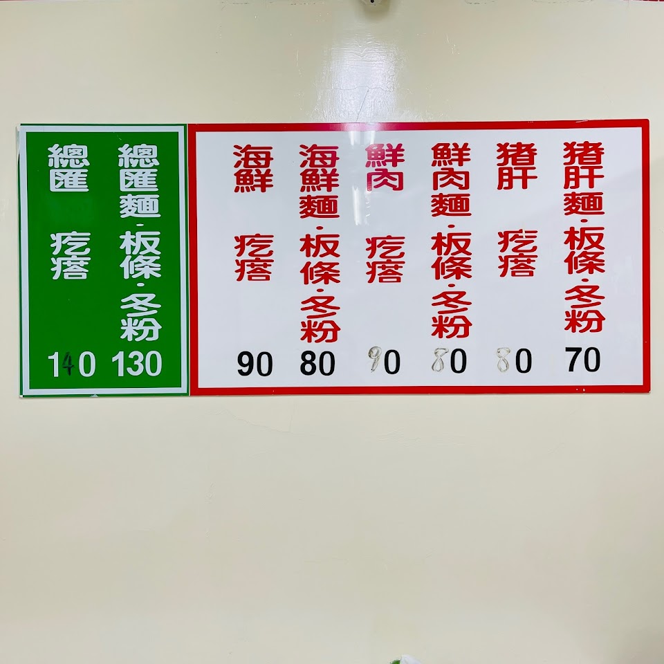 餐單非常單純,就是海鮮、豬肝和鮮肉,與麵、麵疙瘩、板條和冬粉排列組合。 價格適中、口味不錯,用餐時間人非常多,我認為唯一的缺點是沒有小菜,即使麵加大,下午也容易覺得餓…