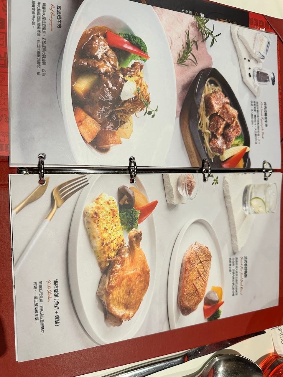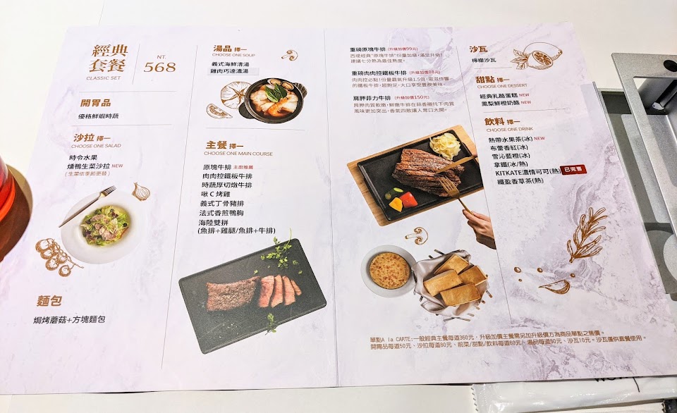 義式海鮮清湯, 優格鮮蝦時蔬, 海陸雙拼 魚 牛排, 焦糖烤布蕾, 脆盆蔬果沙拉, 海陸雙拼 魚 雞, 肉肉控鐵板牛排