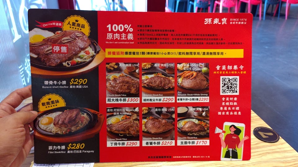 餐點新鮮,誠意滿滿。在外帶的事前打包處理上,也見店家用心。陳設上,雖秉持一貫紅色基調,但好在是臨道路,光線充足,不至於給人昏暗的感覺。平價牛排店家的選擇上,仍是家人首選。