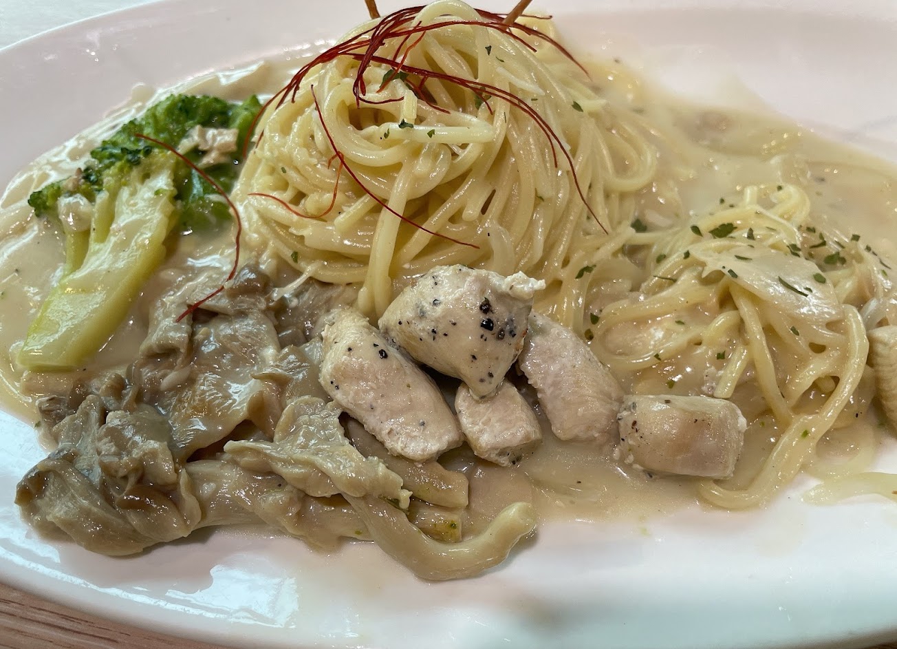 我點的蒜香義大利麵調味太淡了,上面的雞胸肉又乾又柴還沒有味道。