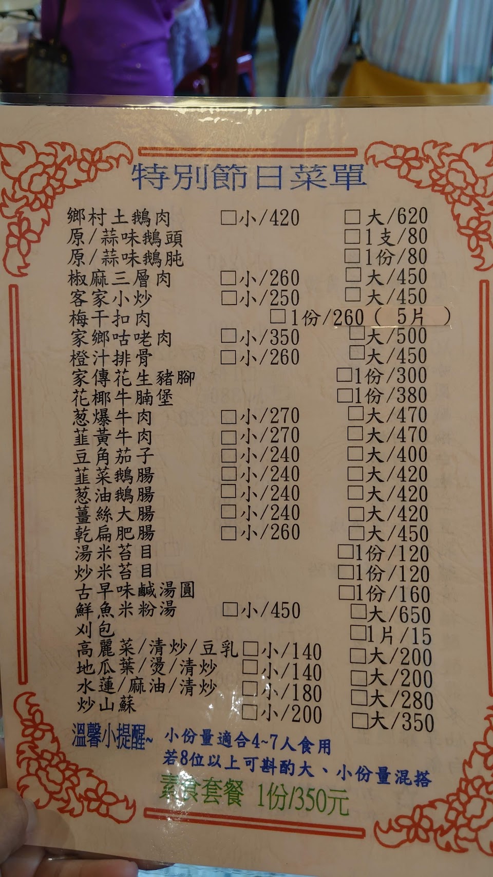 去過幾次,原本客家家常菜口味變成重油口味,變得像路邊攤的口味,根本不像餐廳。 當日2大1小用餐,每道菜都說要小盤的,結果地瓜葉還是送上大盤的,鵝肉超貴,一隻鵝腿要價400元。 誠心建議,不要跟錢過不去,而且真不好吃。