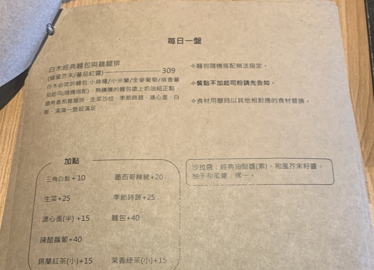 為了慶祝父親節,帶著老公及兩位女兒來到了白木餐廳,分別點了蜂蜜芥末雞肉、青醬雞肉帕里尼、雞肉辣椒麵、櫛瓜雞肉燴飯,還有酸溜溜檸檬塔、橙酒布朗尼,以及莓果冰紅茶、濃情、焦糖、藍莓熱可可,滿足了我們的味蕾及心情。帕里尼的香烤吐司夾著番茄、洋蔥的青蔬及芥末、青醬的濃厚醬汁,層層美味,好豐富的口感。而雞肉辣麵,濃郁微辣塔香起司混著滑嫩雞肉,香而有味,一口接一口的飽足感。布朗尼或檸檬塔的甜點很有質感,可可上拉花十分親和可愛,都讓我們吃得好滿足,也值得向大家推薦呀!