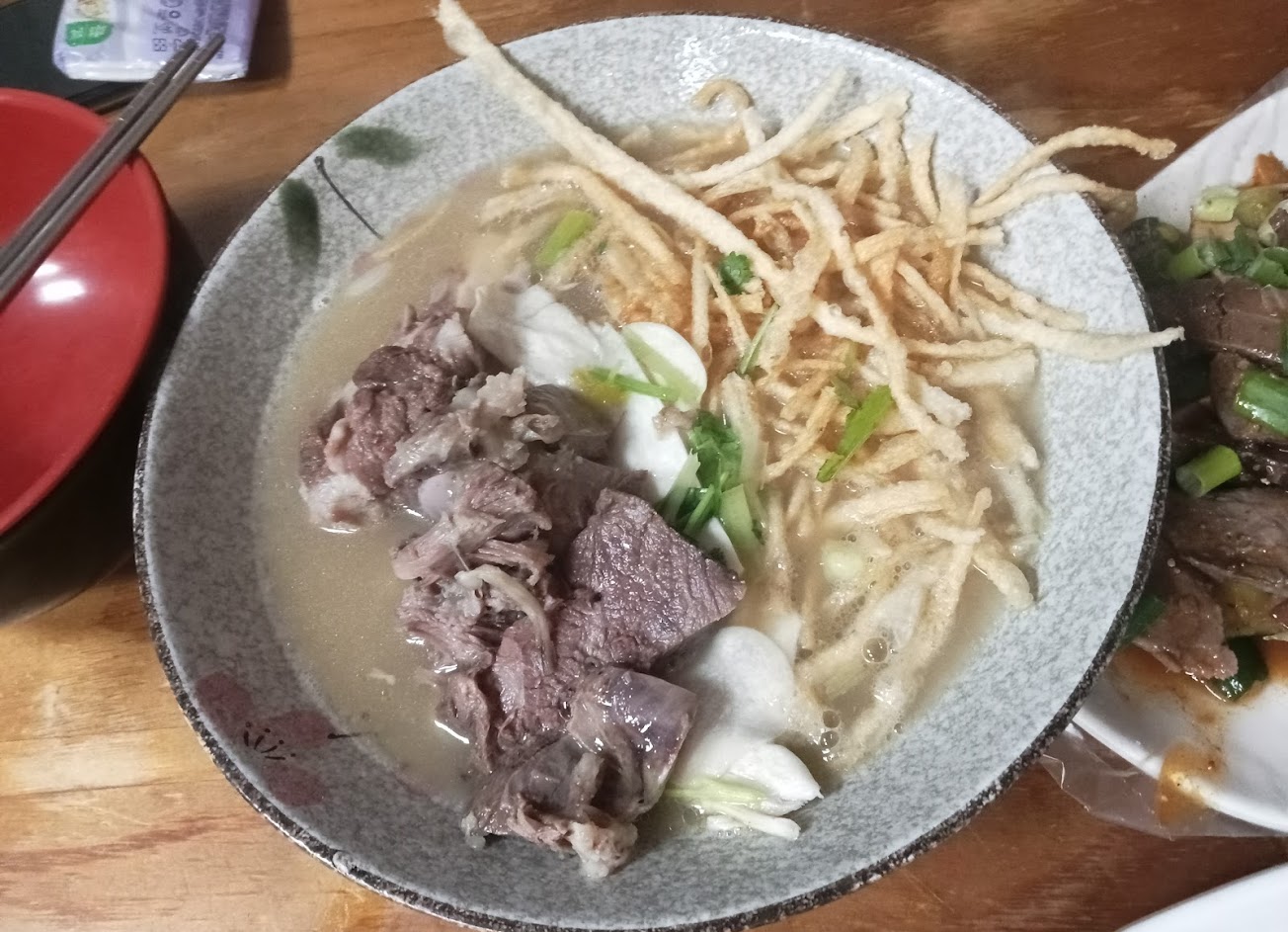 店家很熱心介紹店中食品,但是用塑膠袋套盤子,感覺像是路邊攤且很不環保。 店家推薦醬龍骨,非常不推…200/盤,大部分是骨頭,肉已經剔下做成其他菜品了,有被當盤子的感覺。 饊子有點像炸意麵,羊肉拉麵好吃,份量不大…意猶未盡。 桌子之間很靠近、桌面和地板較油膩,很可惜。 服務 內用 餐點類型 晚餐 平均每人消費金額 $200-400 餐點:3 服務:3 氣氛:3 建議的餐點 羊肉拉麵 撒子雙拼