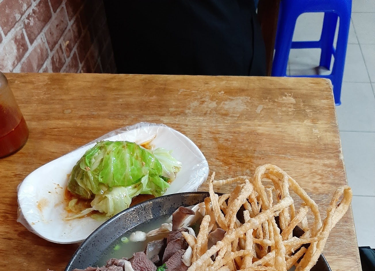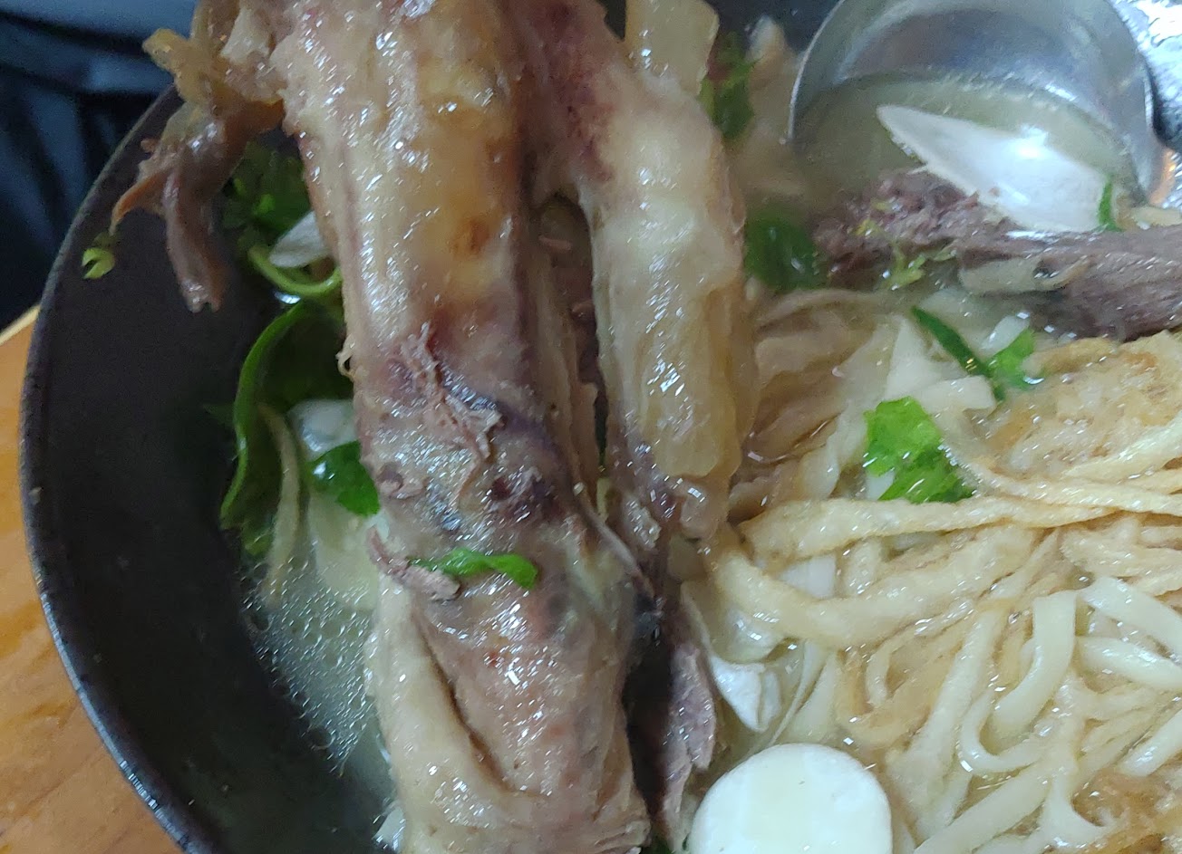 朋友說麵是現拉手做的一條長麵(沒去攤前看來確認),可的確是手拉麵條,湯可以無限制加湯喝到飽,店員經過時是真的會問你是否需要加湯!