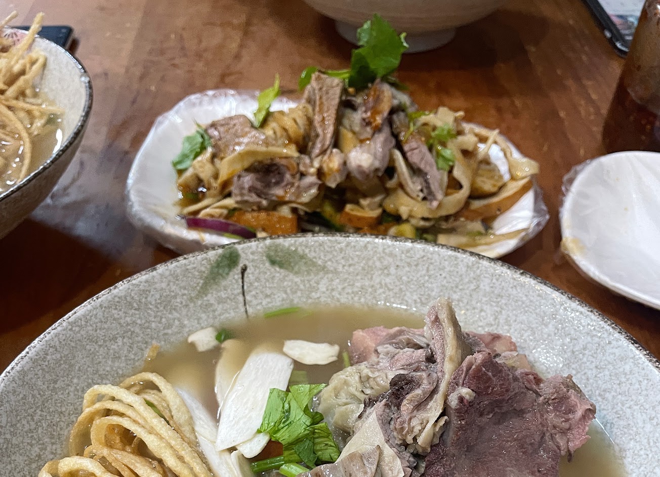 點了牛,羊湯麵品和小菜,食物份量足,肉品處理到沒有羊羶味, 軟硬度剛好軟嫩又不乾柴,且湯麵的肉品量很多,涼拌豆乾的青菜也很新鮮清脆,醬龍骨的孜然味很棒。會想再訪的店,食物都很美味,點多了吃不完只能外帶,加熱後風味仍然很棒。