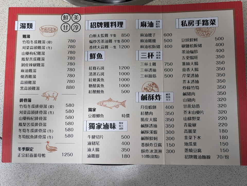 白斬雞肉:這是招牌,好吃 麻油松阪豬:好吃 麵線:這一道超正點,推 薑母鴨:比較像燒酒鴨,不錯 卦菜雞:很像蒜頭雞,也不錯 推薦來試試看!還有傳統溼巾可用 服務 內用 餐點類型 晚餐 平均每人消費金額 $600-800 餐點:5 服務:4 氣氛:4 建議的餐點 白斬太監雞半, 刈菜蒜頭雞湯 停車位 很多停車位