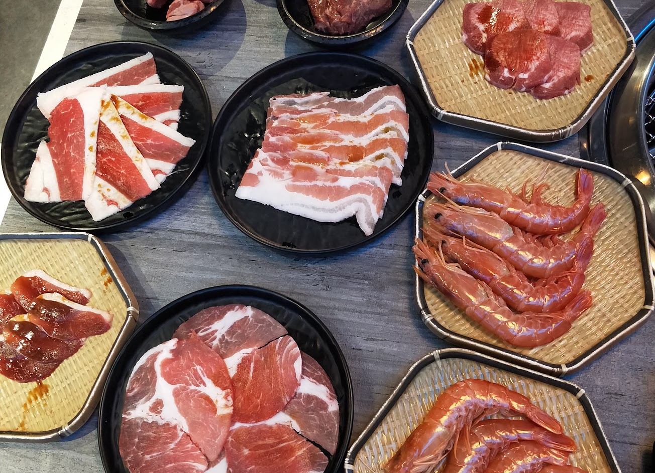 燒肉限時2小時吃到飽,肉質好,醬料很特殊是另一種吃法,現切肋眼牛排超大塊,五種以上蝦子都很新鮮,和牛肉片超級棒,物超所值,吃過還想會再來。
