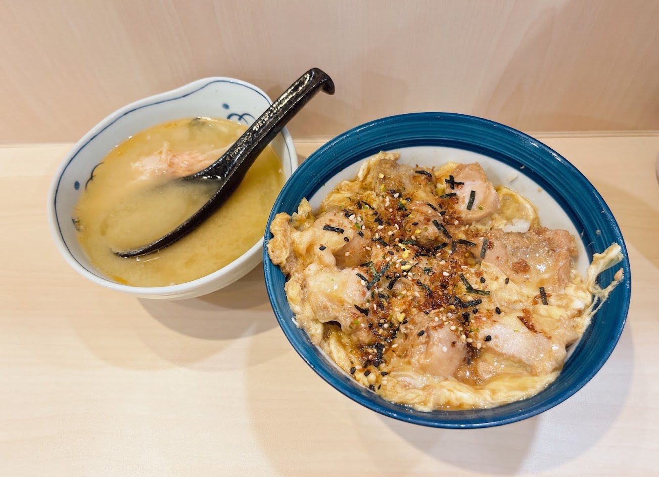 親子丼好吃、份量很足夠,贈送的味增湯裡有鮭魚肉,還可以續湯!