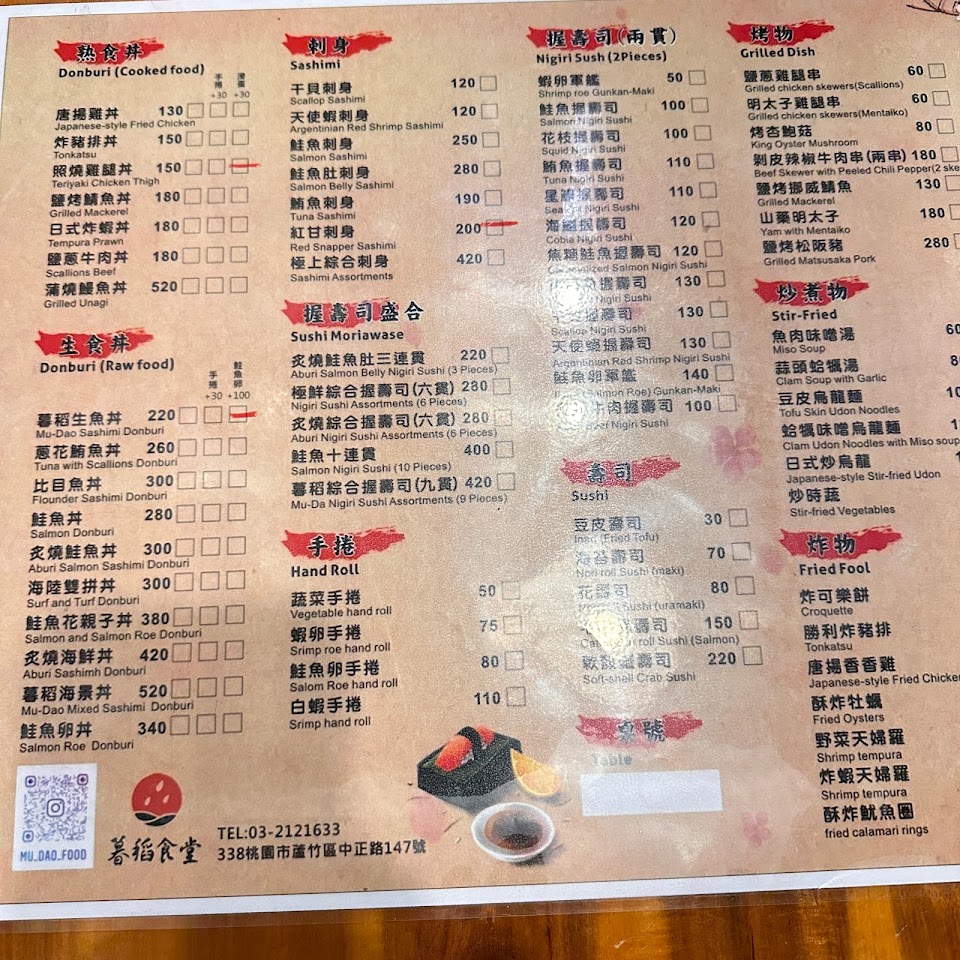 暮稻食堂日式料理,在蘆竹南崁交通要道中正路上,停車對面有地下停車場,選擇非常的多,內用空間比外面看起來的多,味增湯價格不高,但魚料滿滿,還有一顆蝦頭,鮮味十足的味增湯,握壽司炙燒後香甜好吃,那焦香讓食材添加了香氣,口蓋偏具有咬勁不是各個入口即化的,焦糖鮭魚也是相當香甜,炸蝦丼那上面的蝦還可以,但整體偏普通,可能需要加顆滑蛋會比較好吃,明太子雞肉捲上面那滿滿的明太子,非常划算好吃,整體來說非常經濟實惠,是個社區型的好吃日料店。