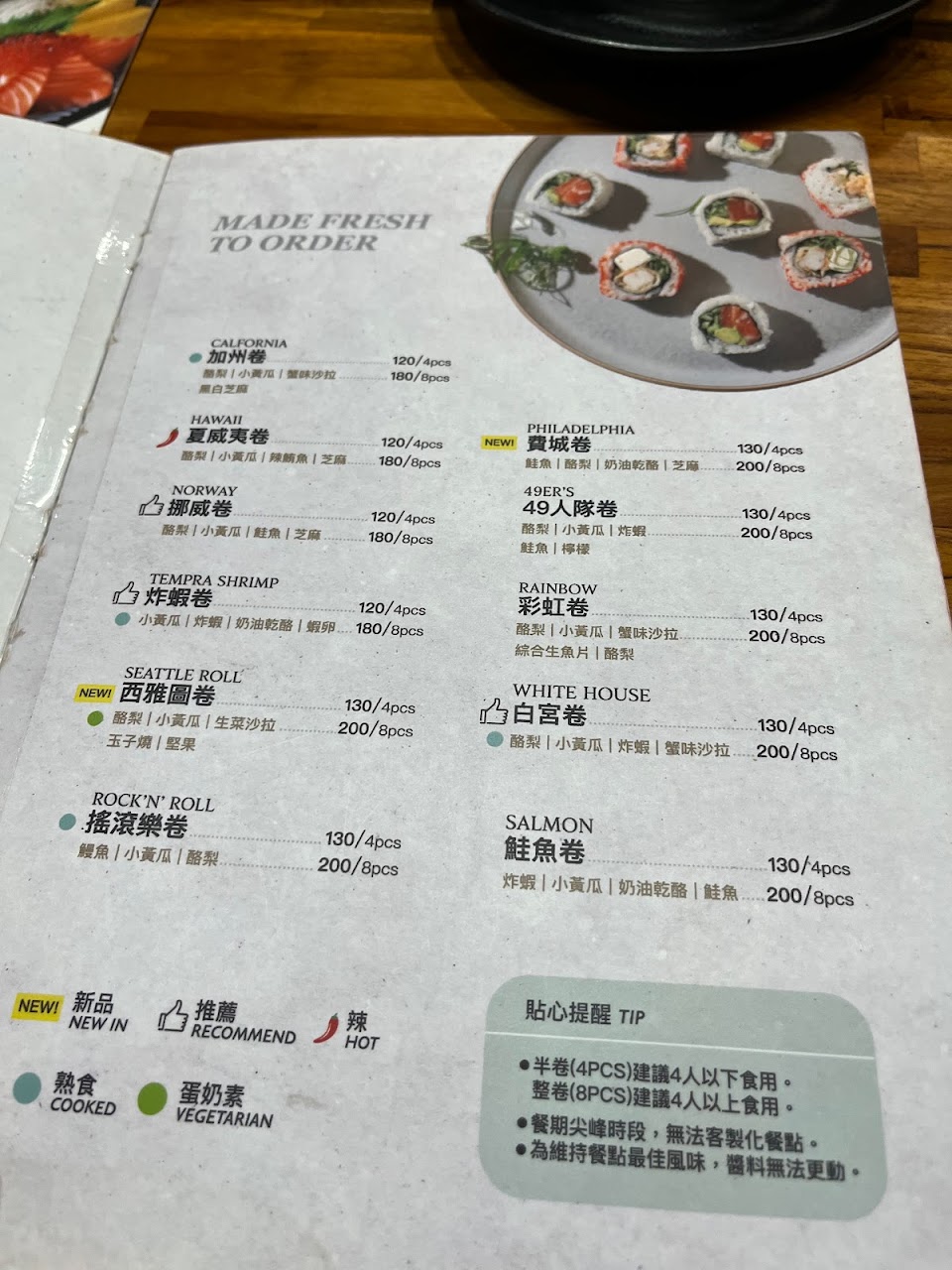 壽司是「日式捲」的算法,一捲8貫花壽司,所以想吃多樣食物的記得點半卷就好,不然很容易吃不完。