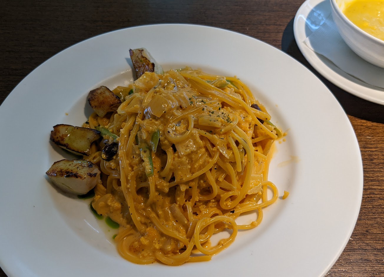 海膽醬意大利麵味道濃郁,還有2顆鮮干貝,海鮮味十足